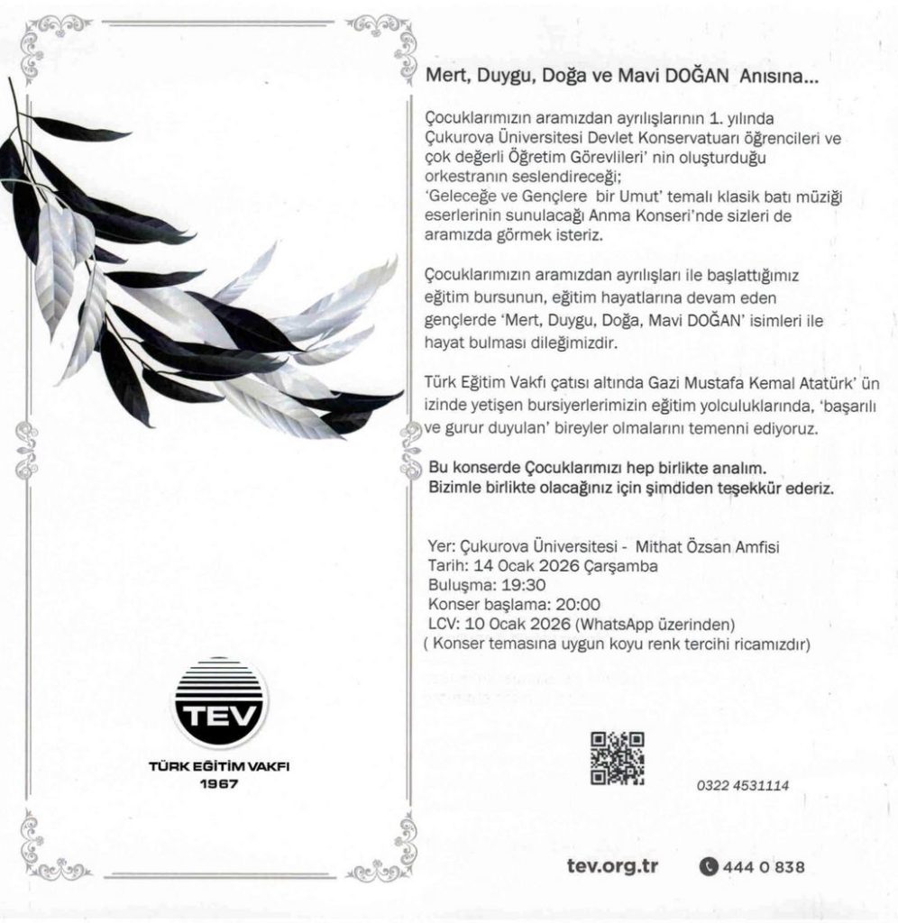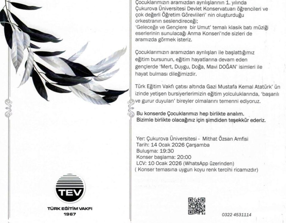 Mert, Duygu, Doğa ve Mavi Doğan’ın aramızdan ayrılışlarının 1. yılında; Çukurova Üniversitesi Devlet Konservatuvarı öğrencileri ve öğretim görevlilerinden oluşan orkestranın seslendireceği, “Geleceğe ve Gençlere Umut” temalı […]